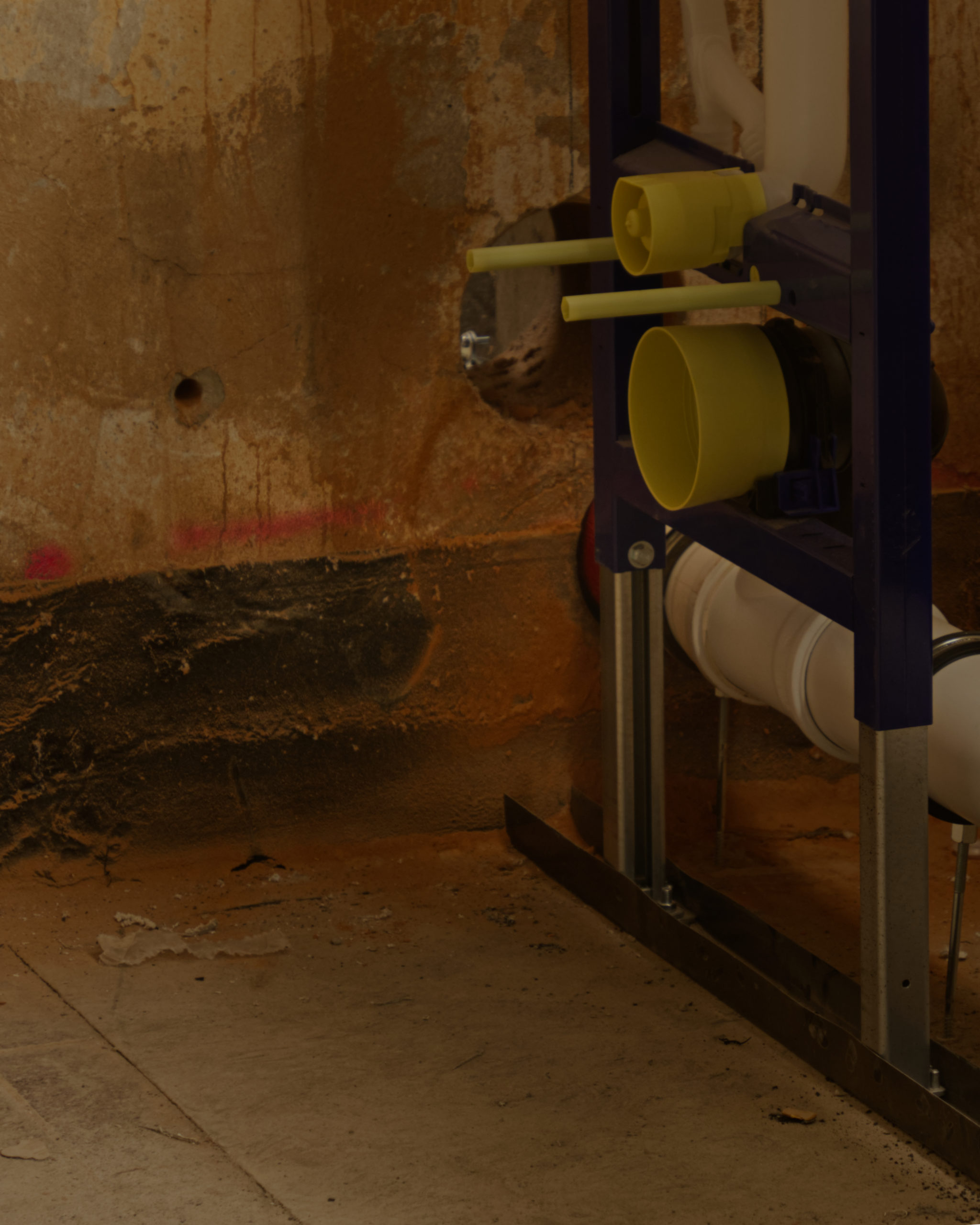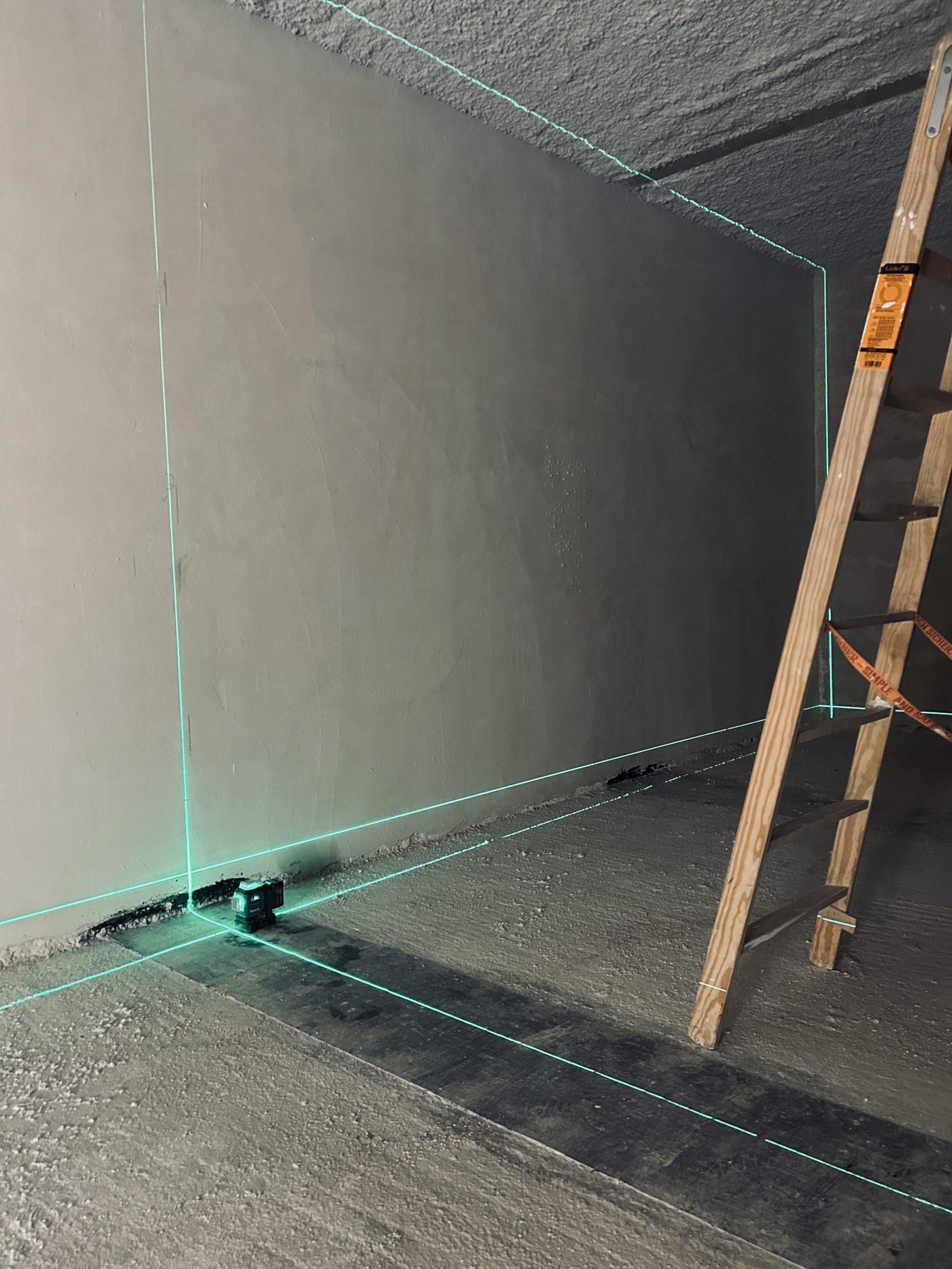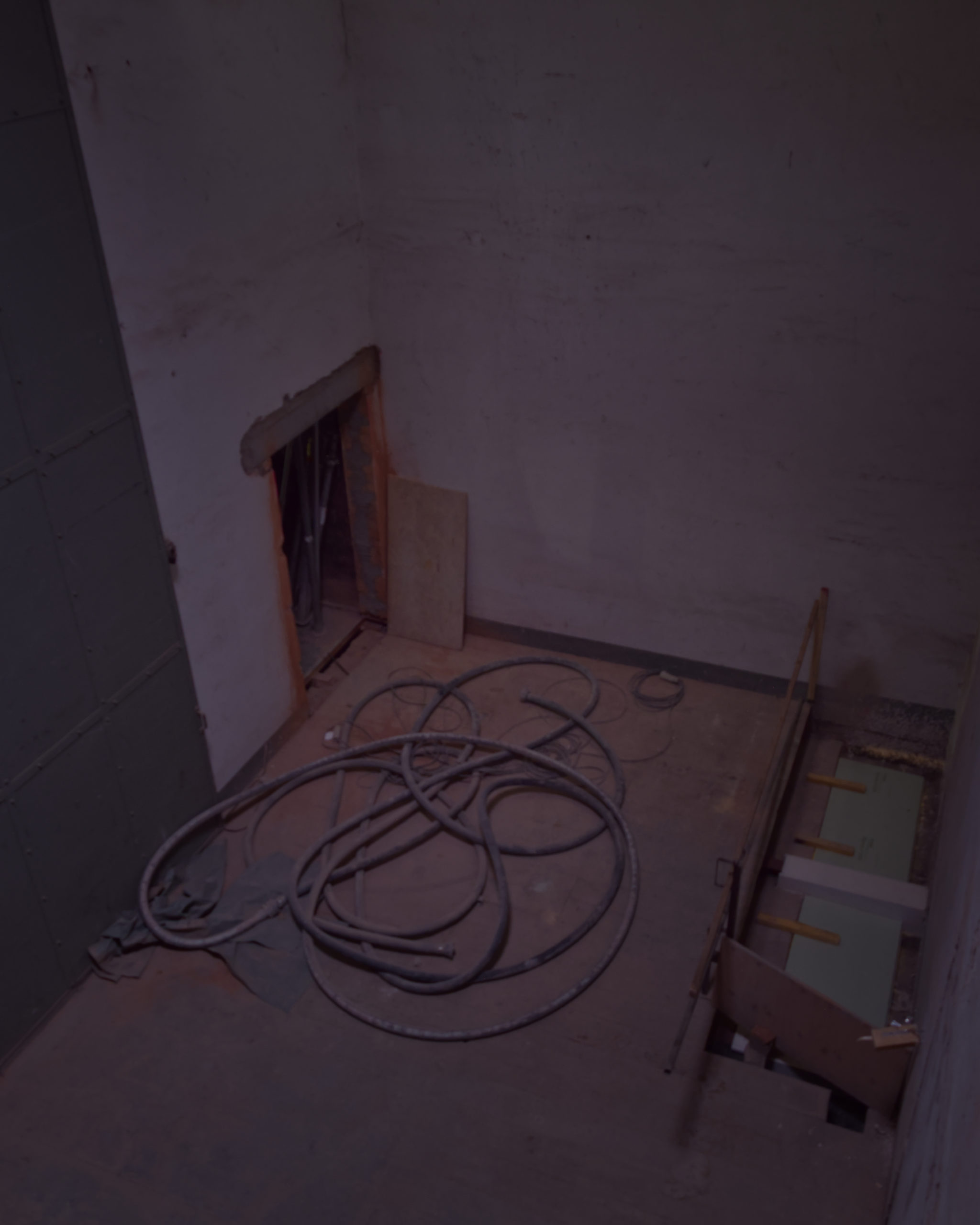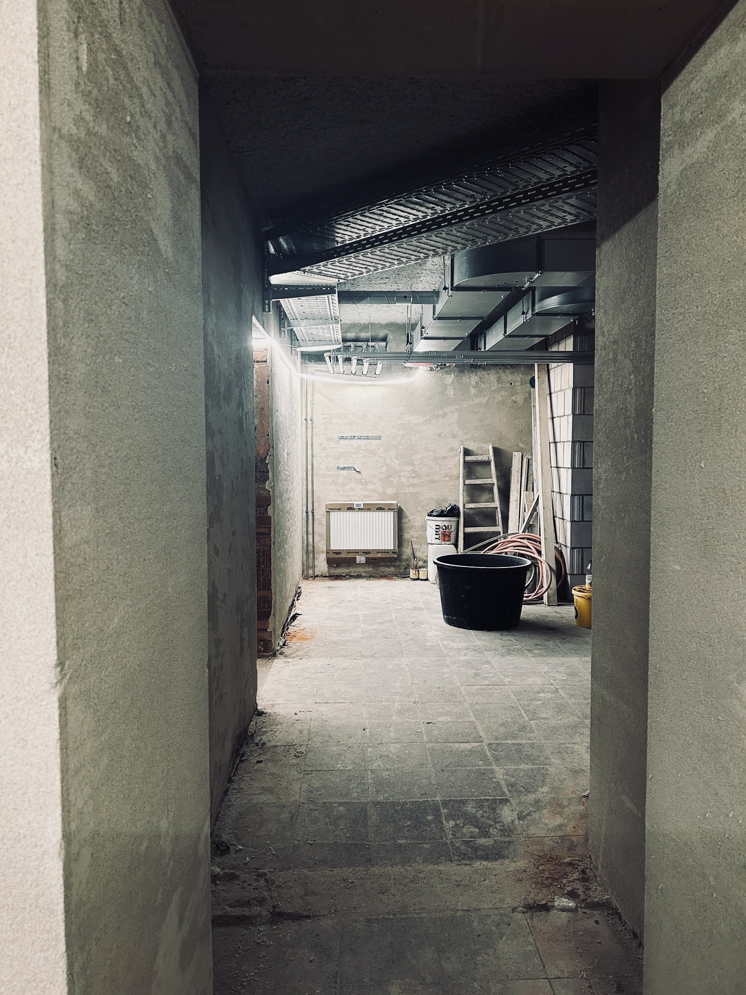 Im Untergeschoss haben der Trockenbau sowie die haustechnischen Arbeiten sichtbar Gestalt angenommen. Die Installationswände der Sanitäranlagen wurden bereits gestellt, und auch die ersten Heizkörper sind montiert. Zudem wurde in Teilbereichen mit der Abdichtung der Bodenplatte begonnen. Die aufgebrachte Bitumenschicht schützt das Gebäude zuverlässig vor Feuchtigkeit aus dem Erdreich und sorgt so für ein dauerhaft trockenes Untergeschoss.