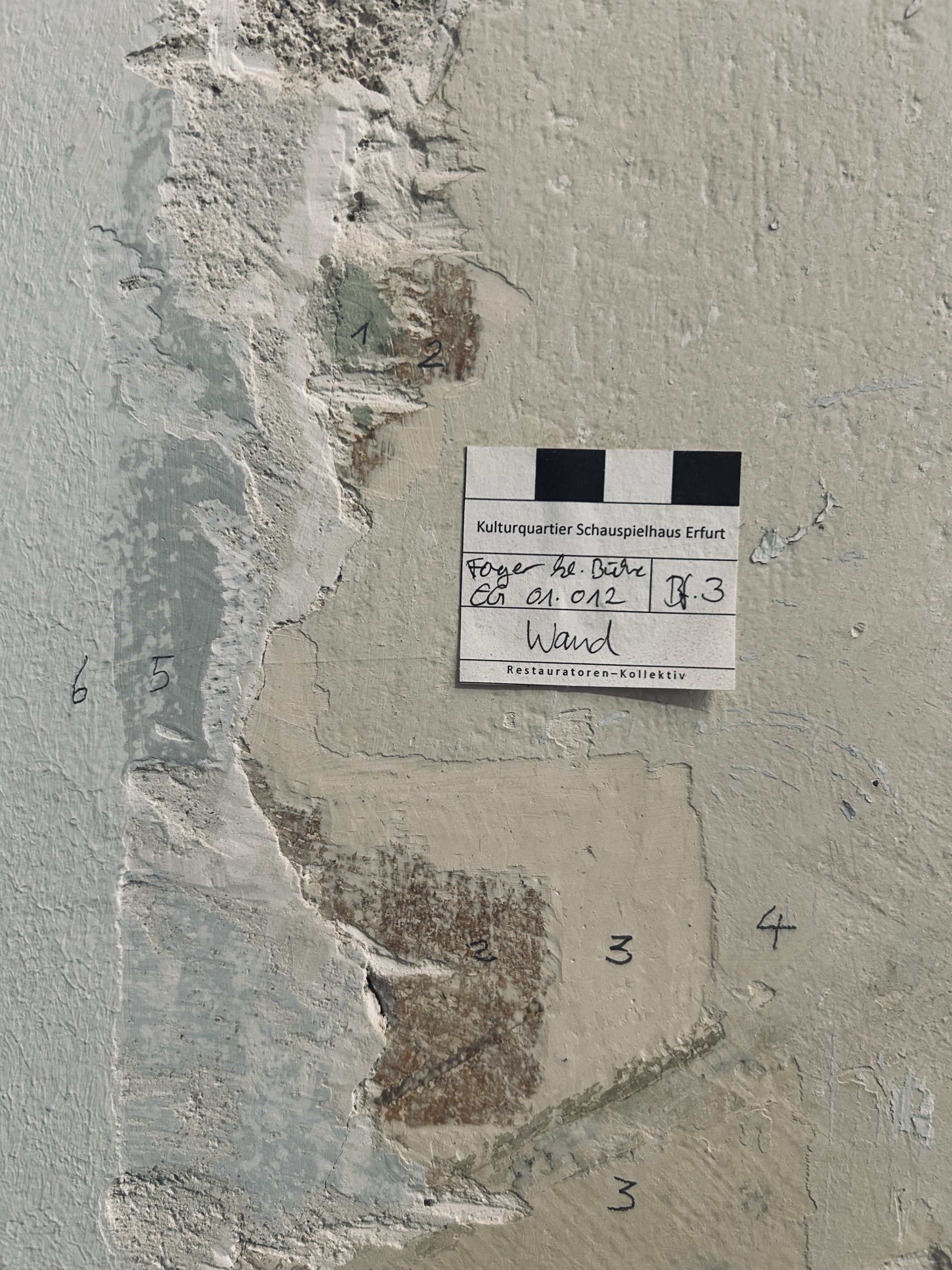 An anderer Stelle im Haus lohnt sich ein Blick auf das Befundfenster, das zeigt, wie vielschichtig die Geschichte des Hauses ist. In diesem sogenannten Befundfenster werden alte Farbfassungen von unserem Restauratoren-Kollektiv freigelegt, nummeriert und dokumentiert. Jede Schicht erzählt dabei ein eigenes Kapitel der Bau- und Nutzungsgeschichte. So lässt sich nachvollziehen, wie sich Räume und Farbgestaltungen im Laufe der Jahre verändert haben. Die unterste, direkt auf dem Putz liegende Farbschicht gilt in der Regel als die früheste bekannte Fassung. Ist diese gut erhalten und eindeutig, lassen sich daraus Rückschlüsse auf die ursprüngliche Wandfarbe im KulturQuartier Schauspielhaus ziehen.