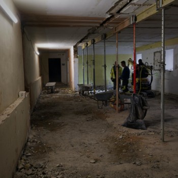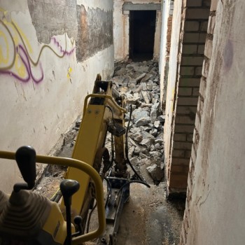 Derweil wird im Untergeschoss der Fußbodenaufbau weiterhin 50cm unter Bestandsfußboden entfernt. Zudem sorgt ERSA-Bau dafür, dass weitere Zwischendecken und Wände weichen, um Platz für die zukünftige Aufzüge zu schaffen, damit unser Haus für alle zugänglich wird. Die Abdichtungsarbeiten von Ulber-Bau gehen in die nächste Phase und zu Beginn der 12 KW starten schon die Tiefbauarbeiten.