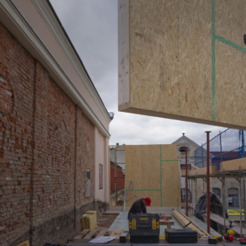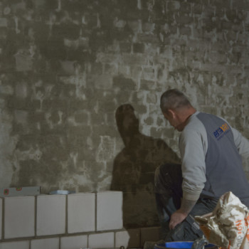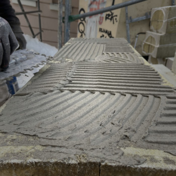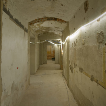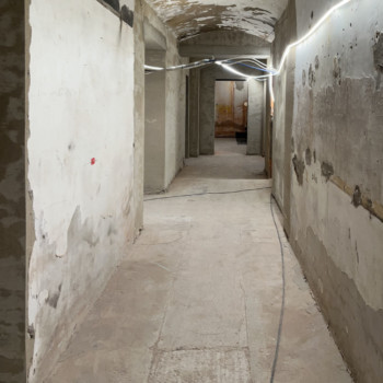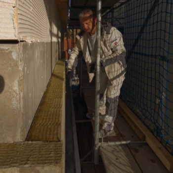 Im Kellergeschoss wurde nach dem Aufbringen des Dämmputzes an der Außenwand die Brandschutzklappe verpresst. Der Dämmputz schützt vor Feuchtigkeit und Wärmeverlust, die Brandschutzklappe verhindert im Ernstfall, dass sich Rauch oder Feuer über die Lüftungsschächte ausbreiten. In Kürze starten außerdem die Dämm- und Putzarbeiten an der Aufstockung des Kinosaals.