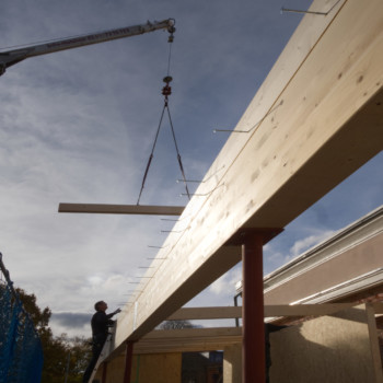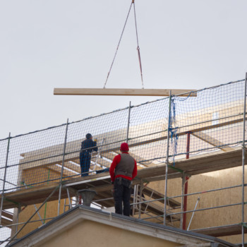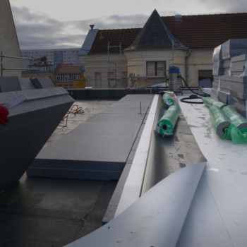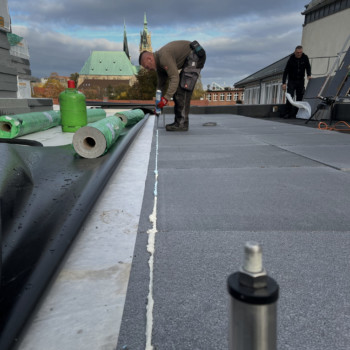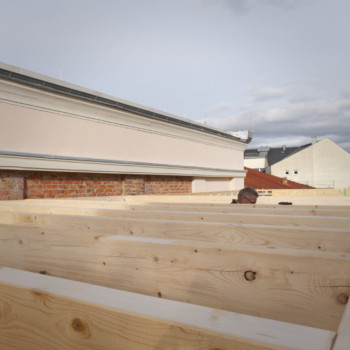 Das neue Flachdach ist geschlossen! Nach der Errichtung der tragenden Konstruktion wurden die Brettschichtholzplatten verlegt, die nun die Dachfläche bilden. Anschließend folgten Dämmung und Abdichtung. Derzeit werden die Anschlussbereiche zum bestehenden Ziegeldach hergestellt – hier entsteht die saubere, dichte Verbindung zwischen den Dachflächen.