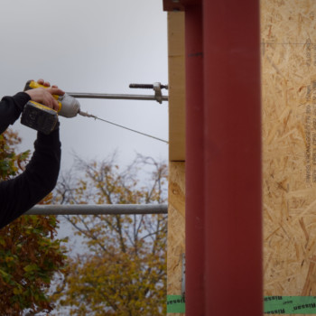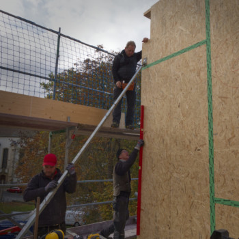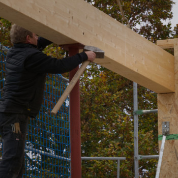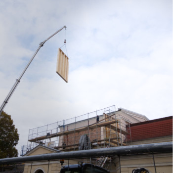 Dank der Zimmerei Eckardt + Rothhardt GmbH steht nun die Holzrahmenkonstruktion. Die vorgefertigten Holzelemente – Wände, Stützen und Träger – wurden aufgerichtet und miteinander verbunden. Damit ist das tragende Gerüst des neuen Gebäudeteils „CUBE“ fertiggestellt. Der einzige Neubauteil unseres Gebäudes.